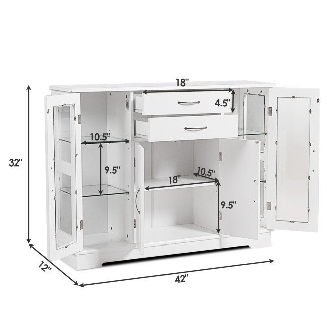 White Wood Buffet Sideboard Cabinet with Glass Display Doors